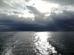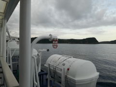 揺れはやや大きく、大島~東京湾入口では歩くのが危ないほどになりました。展望デッキへ出てみようとしたところ、ちょうど船が東京湾に入って揺れが収まります。