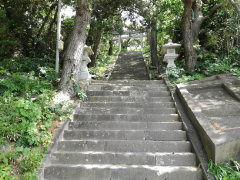 階段を上って物忌奈命神社にお参りします。汗でシャツが湿るくらい日差しが強いです。