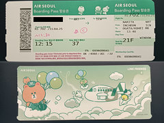 写真上が搭乗券の表面、下が裏面です。LINEのキャラクターとエアソウルの飛行機が描かれていてかわいいデザインです。