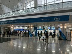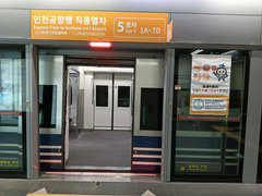 空港鉄道に乗ります。空港鉄道の列車には、運賃だけで乗れる普通列車と、座席予約制でノンストップ運転を行う「直通列車」の2種類があります。この日は飛行機の到着が遅れる可能性を考えて直通列車は予約しておらず、普通列車でソウルへ向かいます。